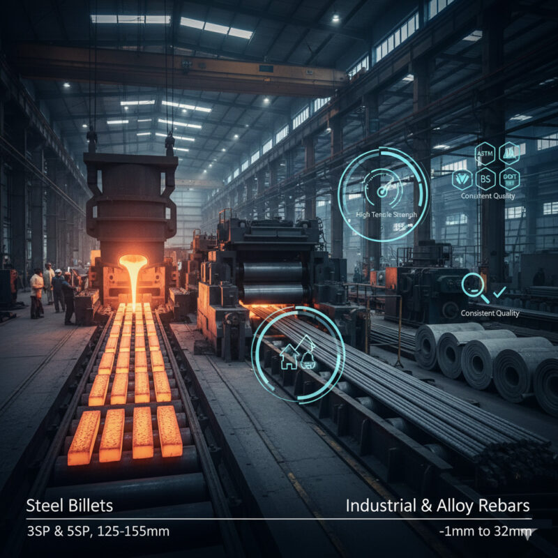 Steel Billets: Import and export of billets (grades 3SP & 5SP) sized 125–155 mm, serving as the base for rebar and other steel sections.